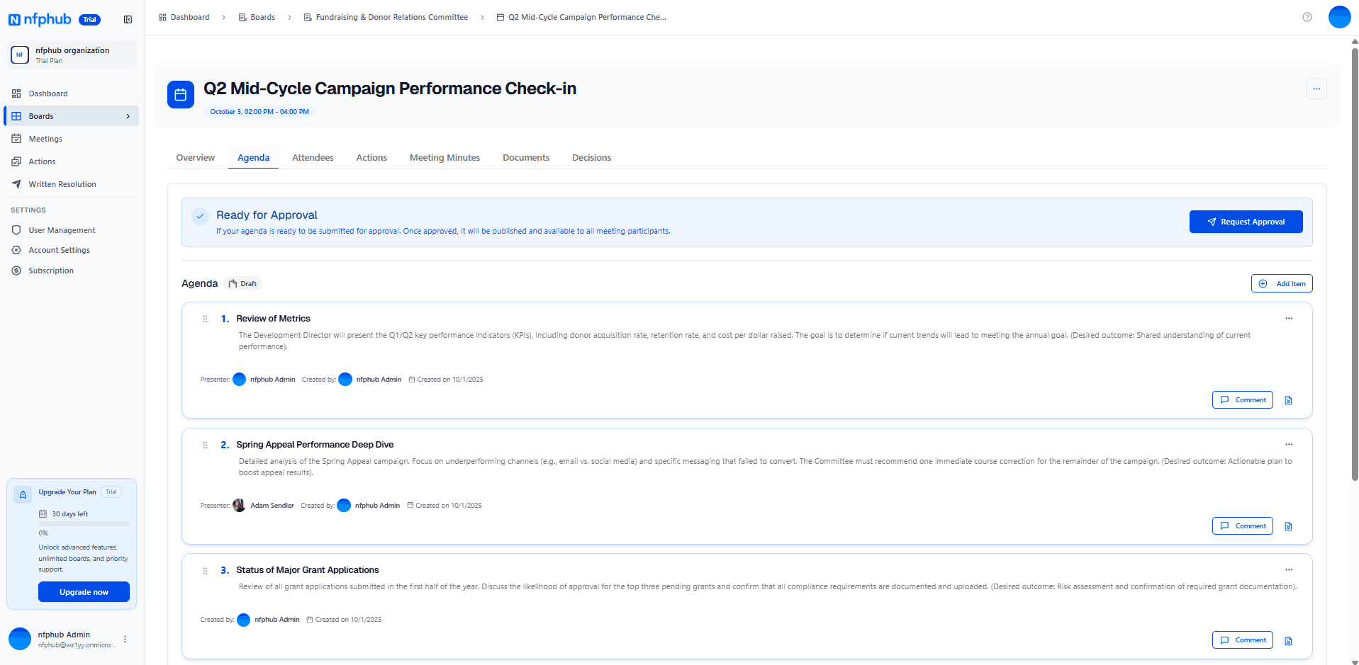 Creating an agenda with NFPHub is fast, simple, and built for the way not-for-profits work. Skip the email chains and messy document versions -- everything you need is in one place.