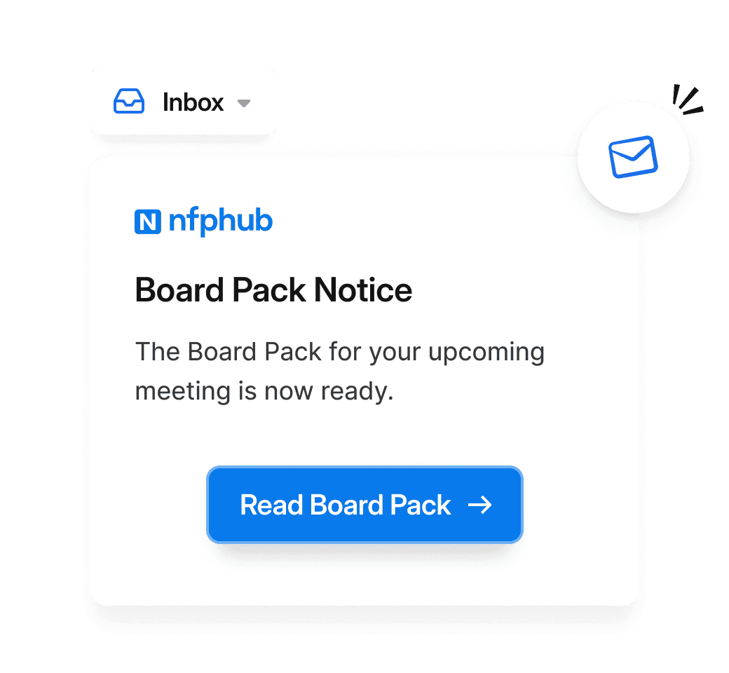 NFPHub automatically gathers your agenda items, reports, and supporting documents into one organized digital pack -- ready to share with board members in seconds. Save hours of administrative time and ensure every member receives the correct information, professionally formatted and accessible from any device.