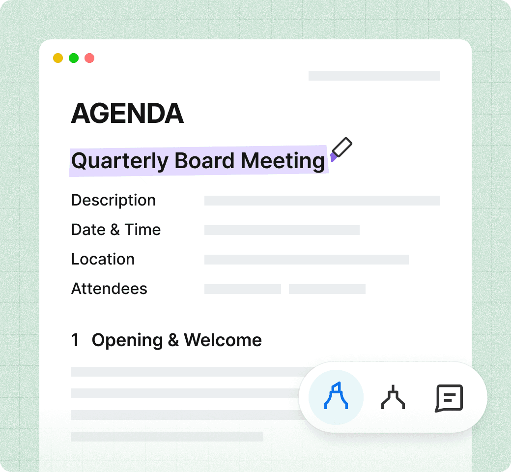 Board members can securely add private annotations to documents, keeping their comments and highlights fully confidential. Mark key points, draw attention to details, or leave comments for later reference -- all within the board pack. Easily switch between reading and annotating, or hide all notes in one click for distraction-free viewing.