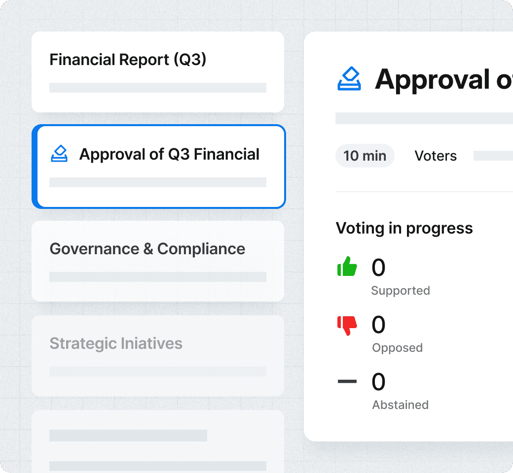 Create votes directly within your agenda items, attach supporting documents for context, and set clear deadlines. Board members can review materials and cast their votes before or during the meeting -- ensuring informed decisions every time.