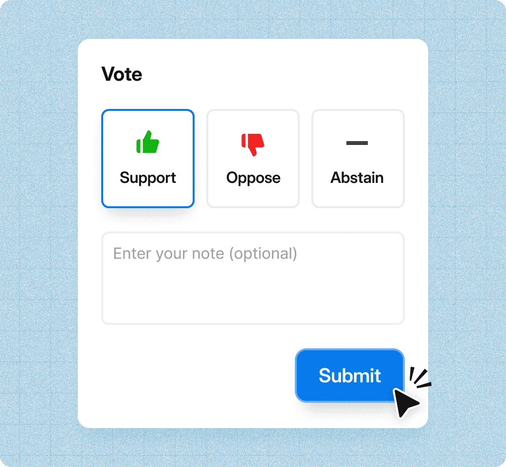 Members can approve, disapprove, or abstain with a single click. Remote participants vote with full confidence, and administrators can manage results with oversight controls and email confirmations. Every vote is recorded for your governance trail.